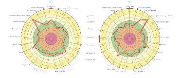Fig. 6.1, 6.2 dezechilbrul energetic înainte de aplicarea frecvențelor (Fig. 6.1 – stânga), și după aplicarea frecvențelor (Fig. 6.2 dreapta). Se poate constata faptul că echilibrul s-a îmbunătățit, numărul organelor și sistemelor a căror activitate este neechilibrată diminuandu-se semnificativ.