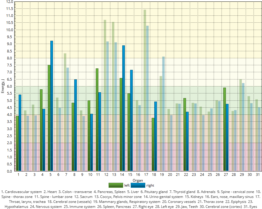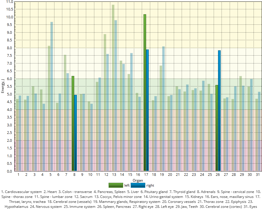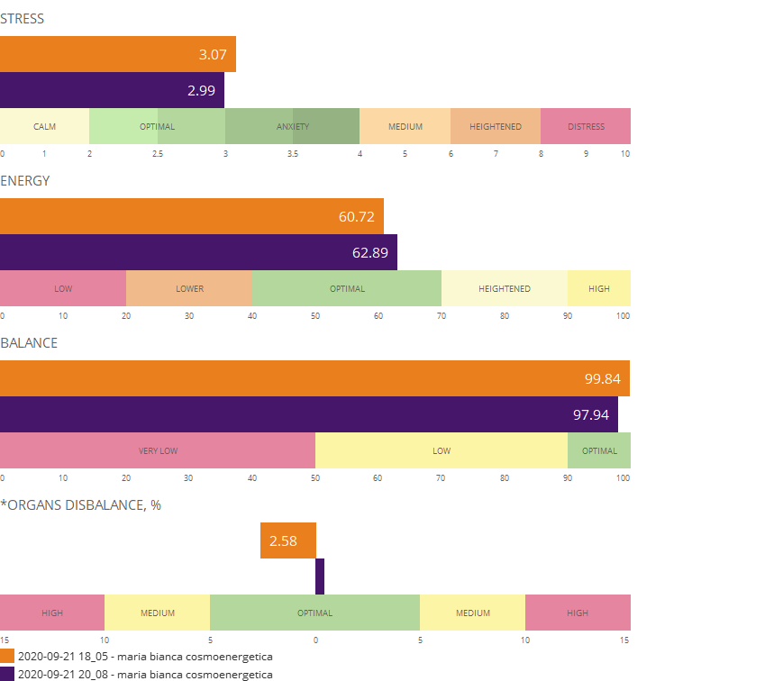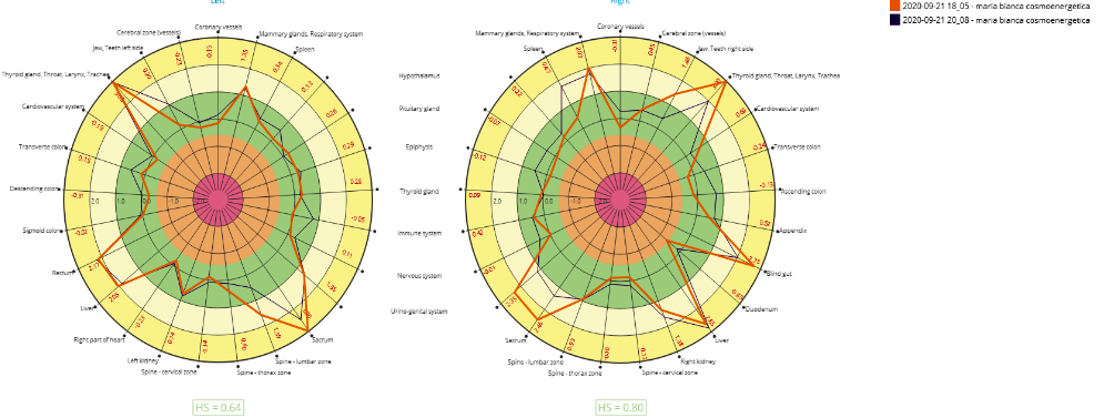 Echilibru stânga/dreapta, și Dezechilibru organe. Analiza energetică ne permite să vedem dintr-o singură privire dacă parametrii de mai sus se află încadrați în zona verde – considerată zona