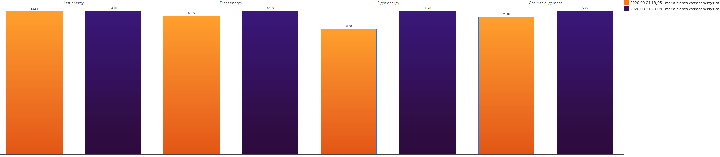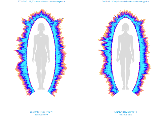 Figura 3: diagrama comparativă a parametrilor energetici înainte de aplicarea frecvențelor cosmoenergetice (culoarea ocru), și după aplicarea frecvențelor (culoare albastru). Sinoptic, se poate vedea efectul frecvențelor cosmoenergetice, și anume scăderea energiei în zona tiroidei si a zonei sacrale, pe partea dreaptă a corpului. Energia a crescut în zona splenică și a colonului ascendent – și a rămas practic neschimbată în toate celelalte zone. Frecvențele nu au influențat deloc celelate zone, ceea ce conduce la o ipoteză empirică despre caracterul selectiv-dedicat al frecvențelor cosmoenergetice folosite in acest caz.