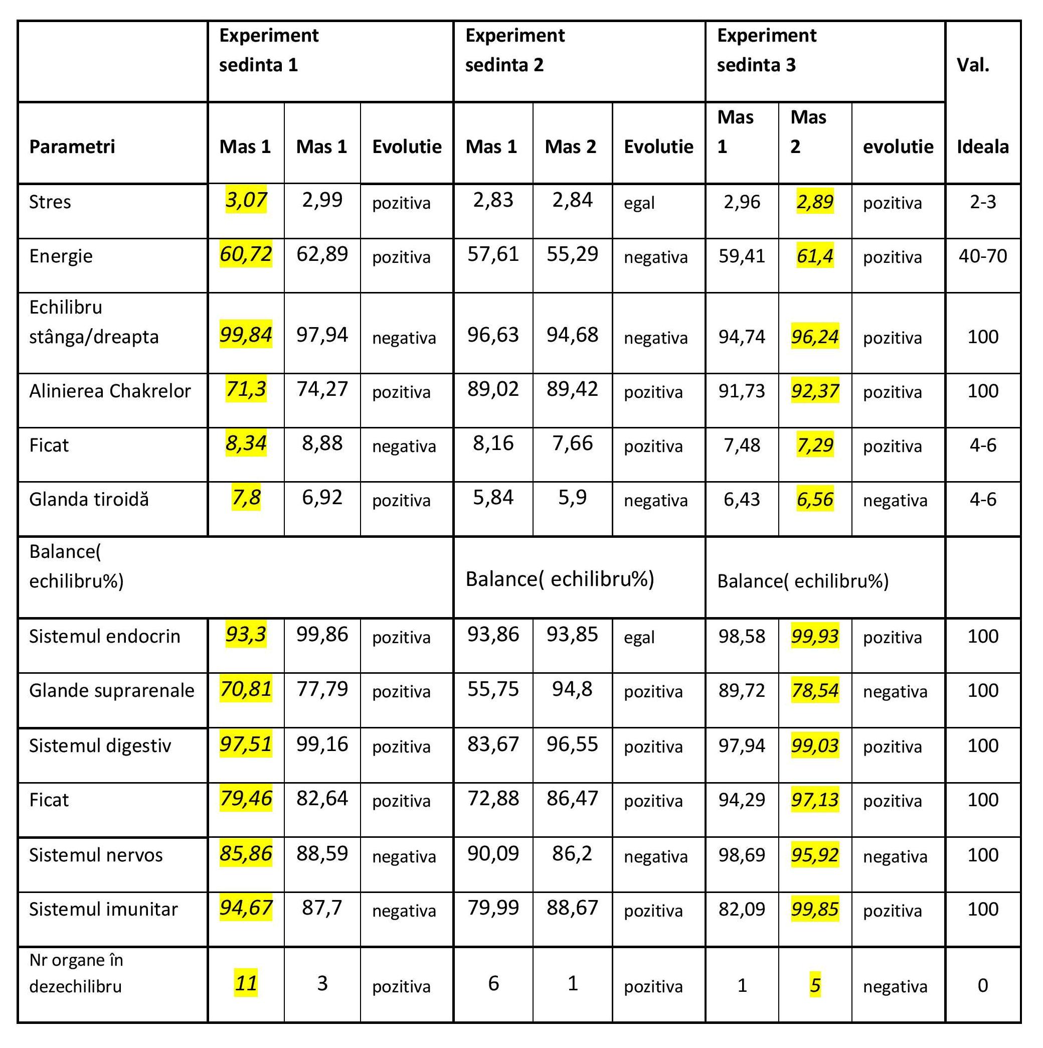 Dacă dorim să comparăm parametrii de la începutul experimentului 1, cu parametrii finali, de la sfârșitul experimentului 3, putem observa faptul că practic toți parametrii, cu excepția echilibrului stânga/dreapta s-au îmbunătățit, unii dintre ei având o evoluție remarcabilă. Mă refer aici la echilbrul energetic pentru ficat și sistem nervos. De asemenea putem remarca un fapt important, și anume că numarul de organe aflate în dezechilibru este același 1, între măsurătoarea 1 și 2. Îmbunătățirile parametrilor sunt în concordanță cu modul în care se simte subiectul după cele trei ședințe de reechilibrare energetică prin metode cosmoenergetice.